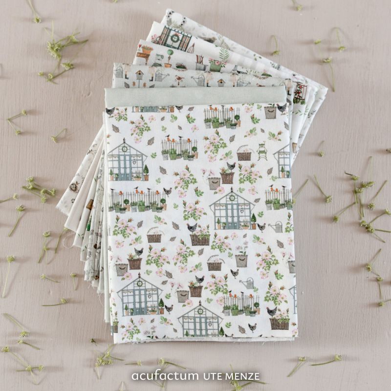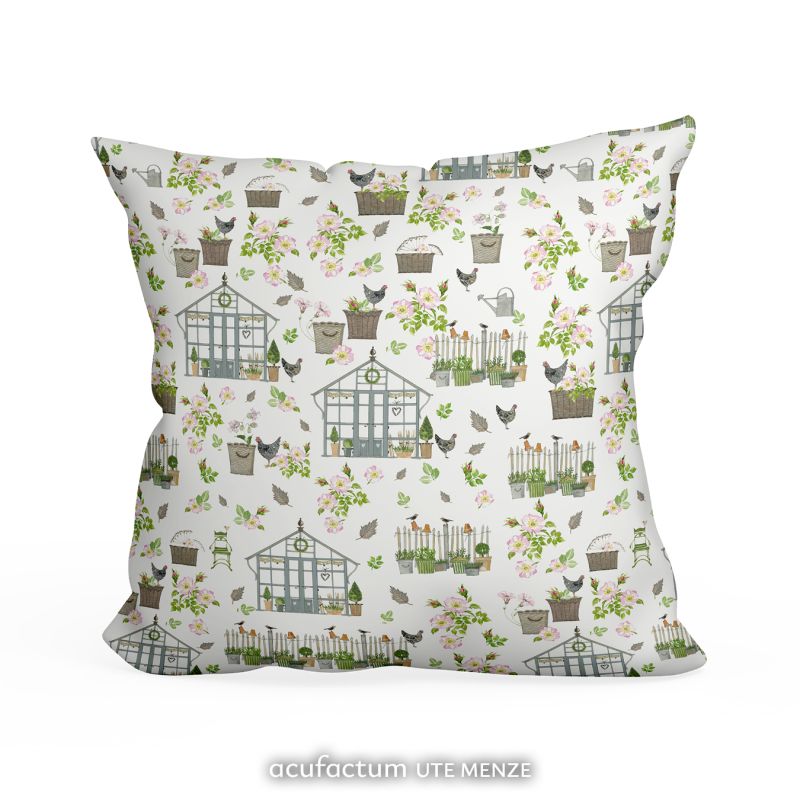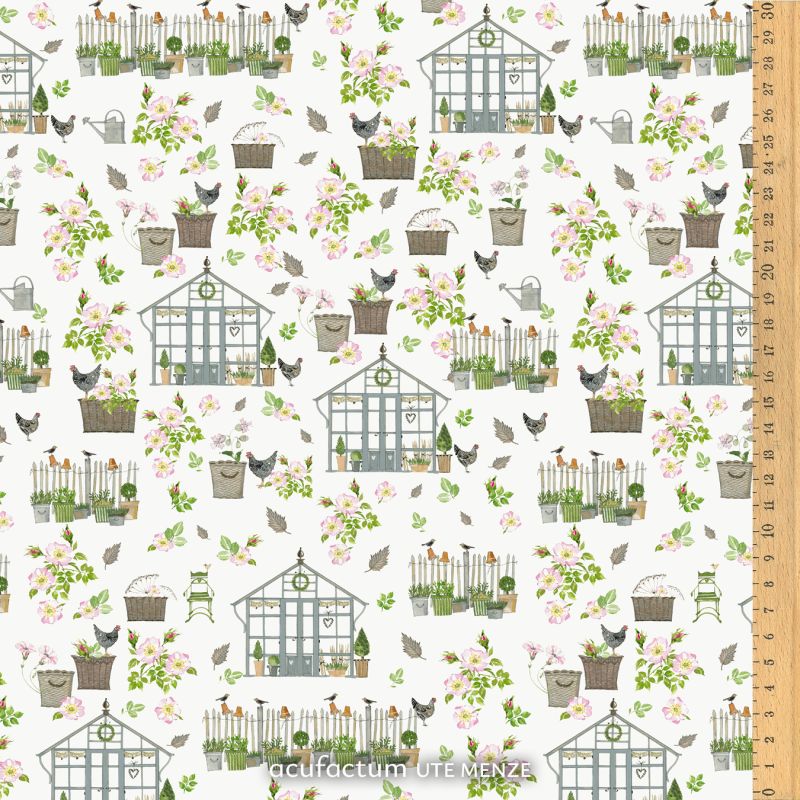 Zwischen den Glashäusern spazieren kleine Hühner und Vögel, während Gießkannen, Rattankörbe und Pflanzgefäße mit üppigen Blüten und frischem Grün das Gesamtbild prägen. Üppige Blüten, fallende Blätter und verspielte Zaunelemente fügen sich zu einem harmonischen Motiv zusammen, das den Charme eines lebendigen Gartens wieder aufgreift. Die hellen Farben und die sanfte Aquarellgestaltung verleihen dem Stoff eine freundliche, einladende Atmosphäre.